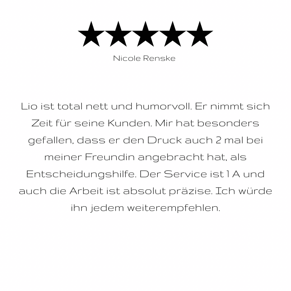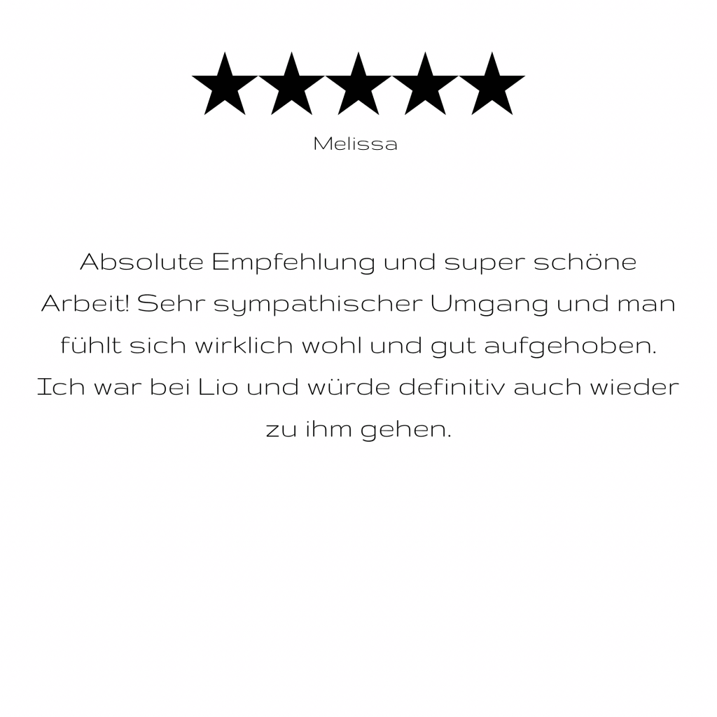 Lio ist ein Mensch mit einem großen Herzen und einer sympathischen Ausstrahlung, die sofort verbindet. Sein hoher Anspruch an sich selbst und seine unerschütterliche Hingabe machen ihn zu einem echten Workaholic, der niemals aufhört, seine Kunst auf das nächste Level zu bringen. Getrieben von dem Wunsch, sich stetig weiterzuentwickeln, gibt er alles, um seinen Kunden stets die bestmögliche Qualität und Leistung zu bieten.