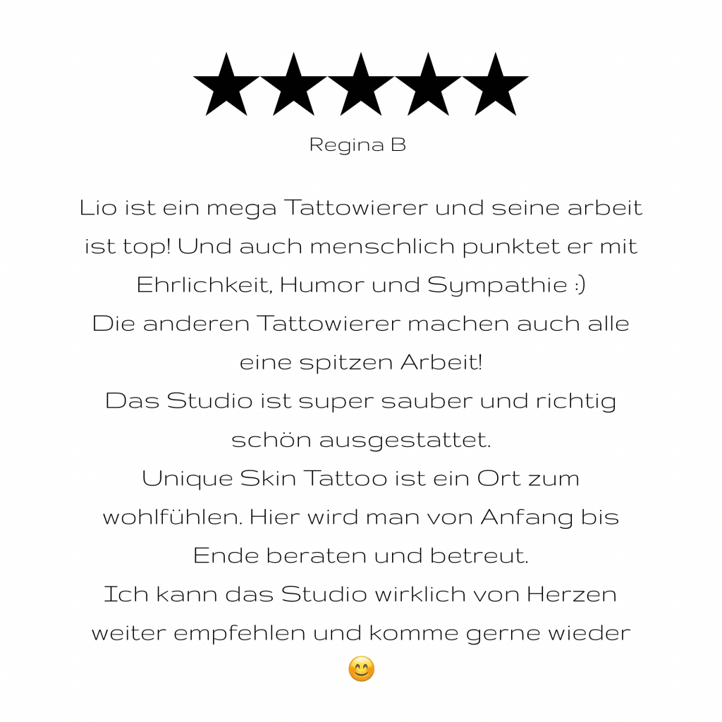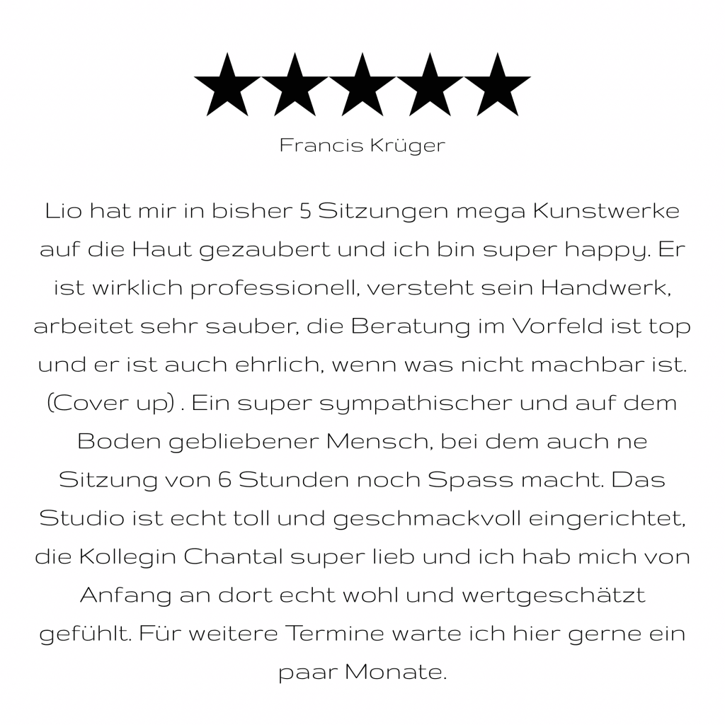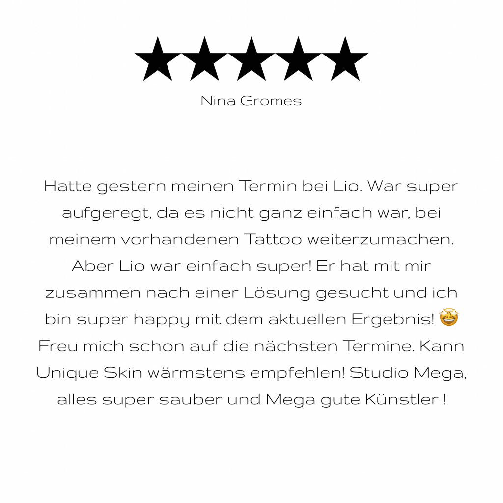 Lio brachte sich das Tätowieren zunächst selbst bei und bewies dabei enormes Talent und Ehrgeiz. Später vertiefte er sein Können in einem Studio, wo er von erfahrenen Artists lernte und seine Fähigkeiten Schritt für Schritt perfektionierte. 2020 erfüllte er sich seinen Traum und eröffnete sein eigenes Studio Unique Skin. Mit inzwischen zehn Jahren Erfahrung gehört Lio heute zu den etablierten Größen seiner Kunst.